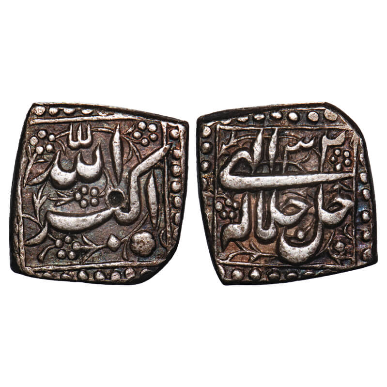 Akbar, Silver Square Rupee, 11.32g, Mintless and Monthless variety, Ilahi type, Ilahi 33, Obv: Allah hu Akbar, Rev: Jal e Jallala illahi year, floral ornamented overall. KM 91.1. Bold Strike, Toned Extremely Fine, Very Scarce.
