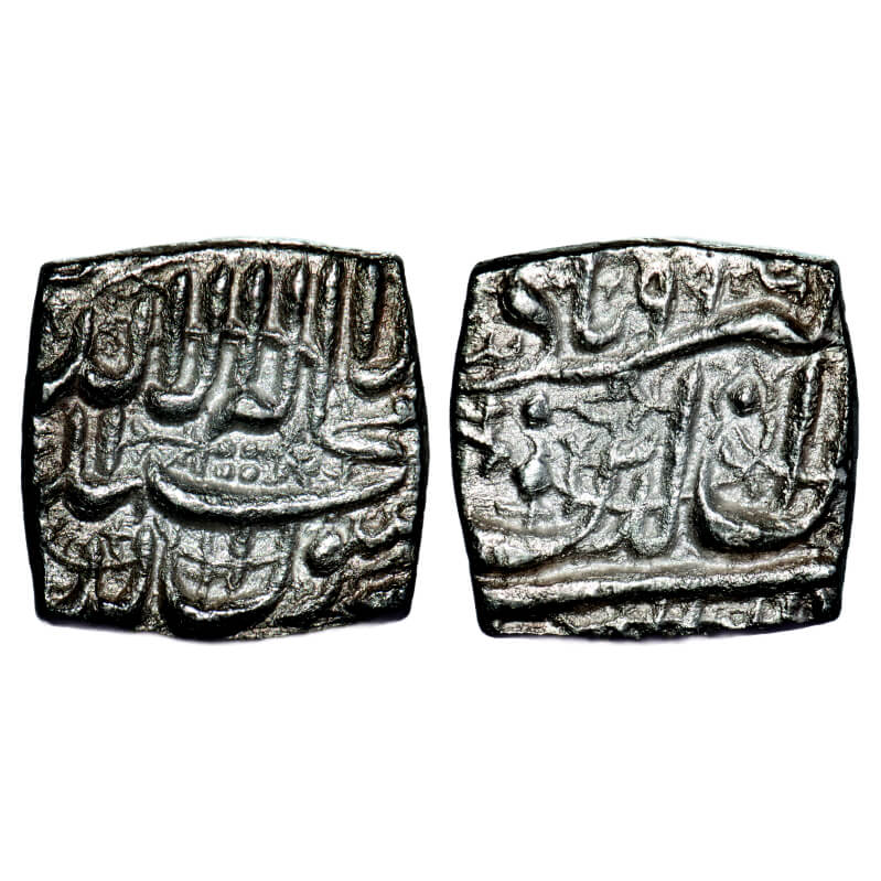 Akbar, Silver Square Rupee, 11.20g, Mintless and Monthless variety, Ilahi type, Ilahi 32, Obv: Allah hu Akbar, Rev: Jal e Jallala illahi year, floral ornamented overall. KM 91.1. Toned Very Fine+, Very Scarce.