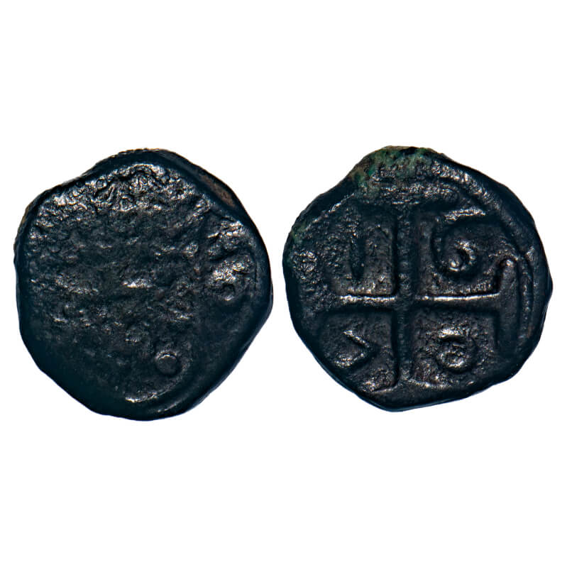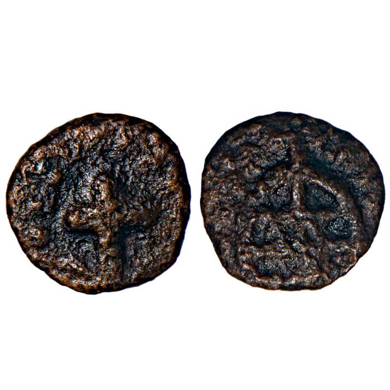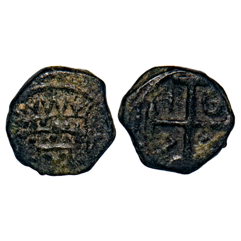 Indo Pourtuguese, Copper 1/4 Bazaruco, 0.60g, Joao III (1521-1557 AD), Cochin Mint, Obv: Cross, Rev: Globe. A.Gomes (page 539) 02.03/ KM 10. Very Fine, Rare.