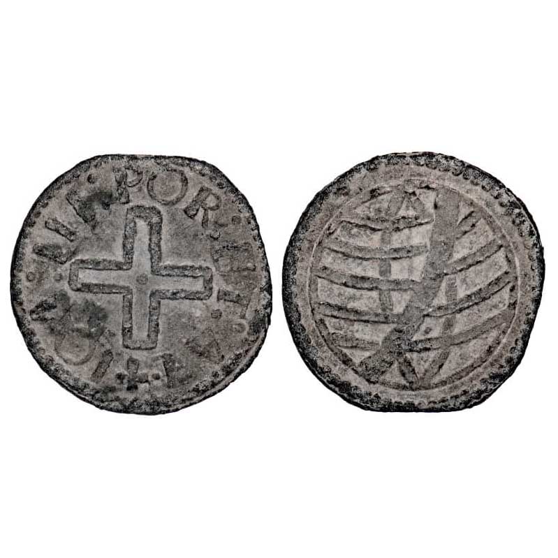 Indo Portuguese, Lead 1 Dinheiro, 2.26g, D. Joao III (1521-1557 AD), ND, (Malacca) Mint, Obv: hollow cross and legends around, Rev: Globe. A.Gomes (page 541) 18.01,/ KM Unlisted. Extremely Fine, Rare.