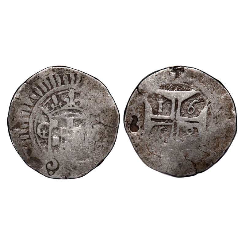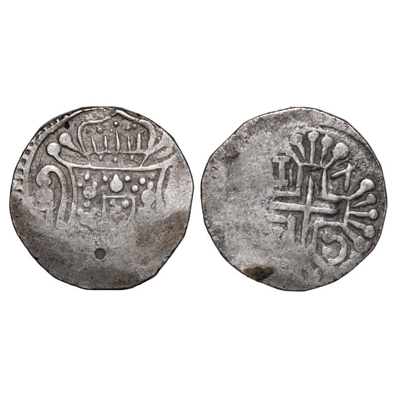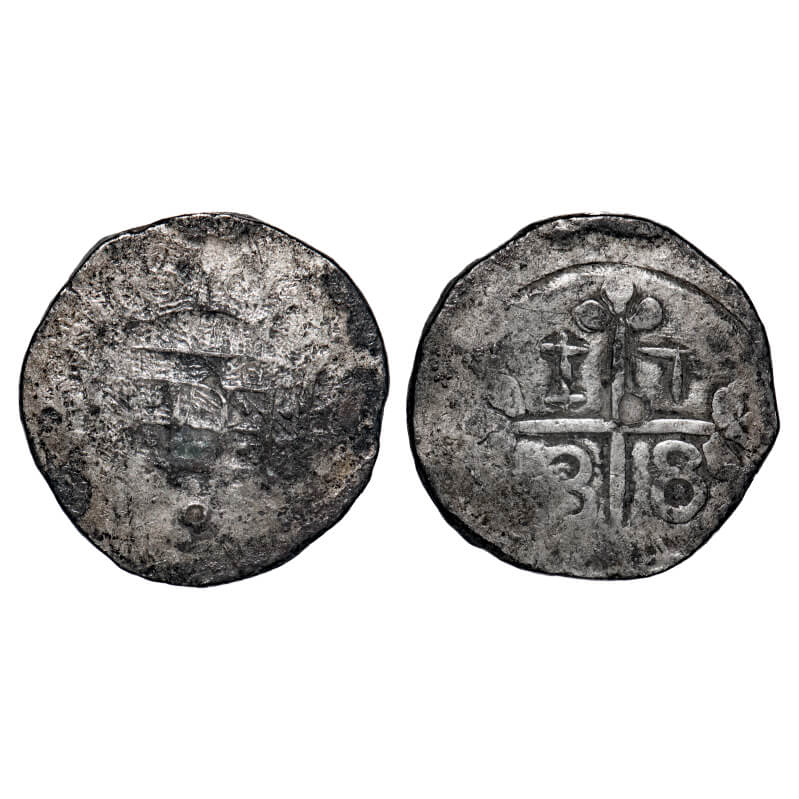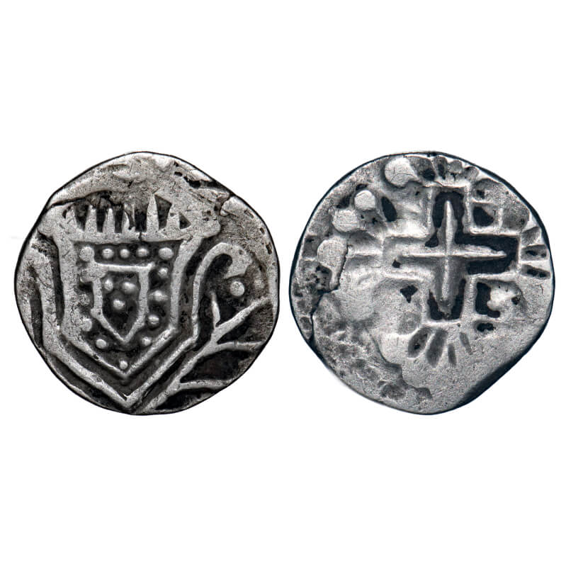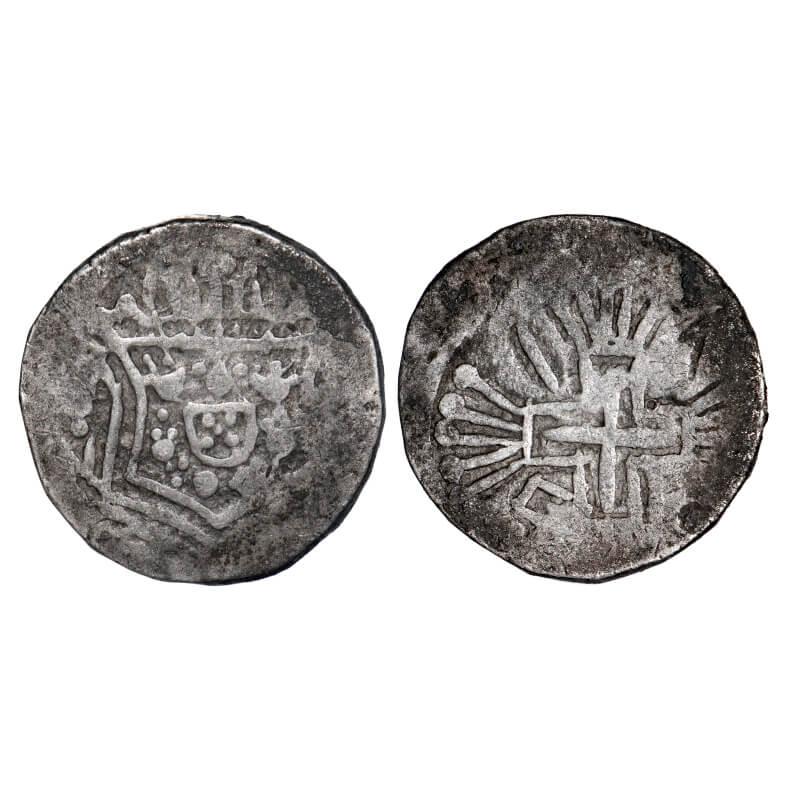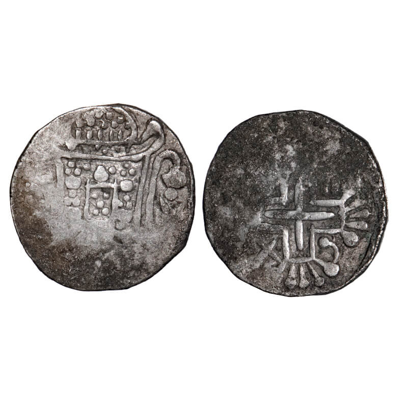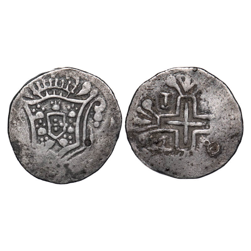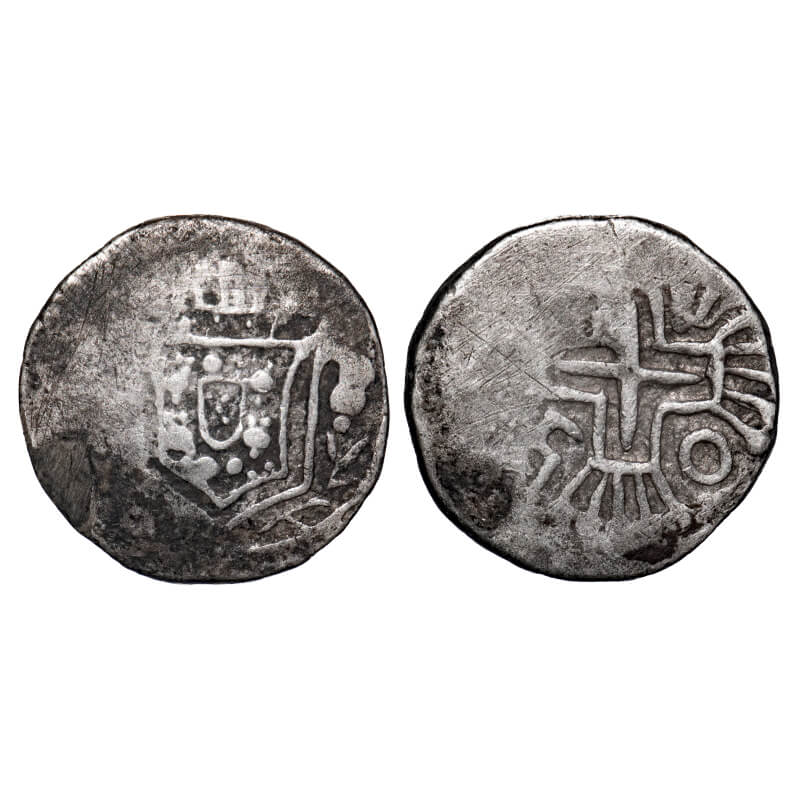 Indo Portuguese, Silver ½ Xerafim, 5.52g, D.Pedro II (1683-1706 AD), ND type, Damao issue. Obv: crude crowned arms in branches, Rev: Voided floreated cross, A.Gomes (Page 559) 08.01 unlisted type (for the somewhat similar die type of crown, refer (A. Gomes page 559) 11.01 (Xerafim type) / KM 4 type. About Very Fine, Extremely Rare.