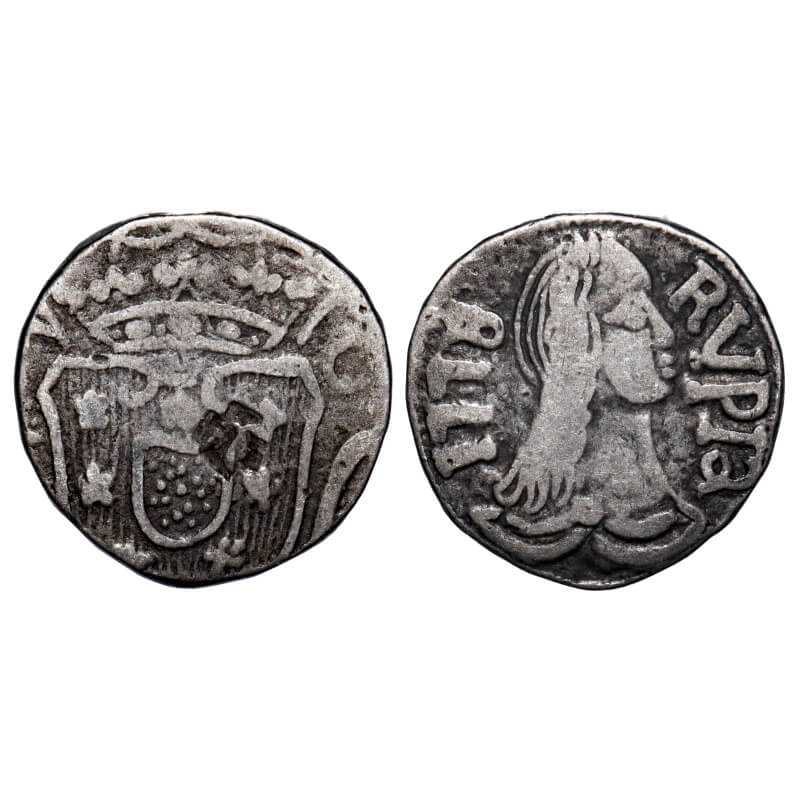 Indo Portuguese, Silver Rupia (600 Reis), 11.74g, D. Joao V (1706-1750 AD), (1)750, Damao issue, Obv: Crowned ornamented Primitive Portuguese Shield (Escudo) of D. Joao V (type unlisted), Rev: interlaced (Entrelacada) Cross with 1750 date within offsets of Cross. A.Gomes (page 570) 78.06 / KM 24. Very Fine, Rare.