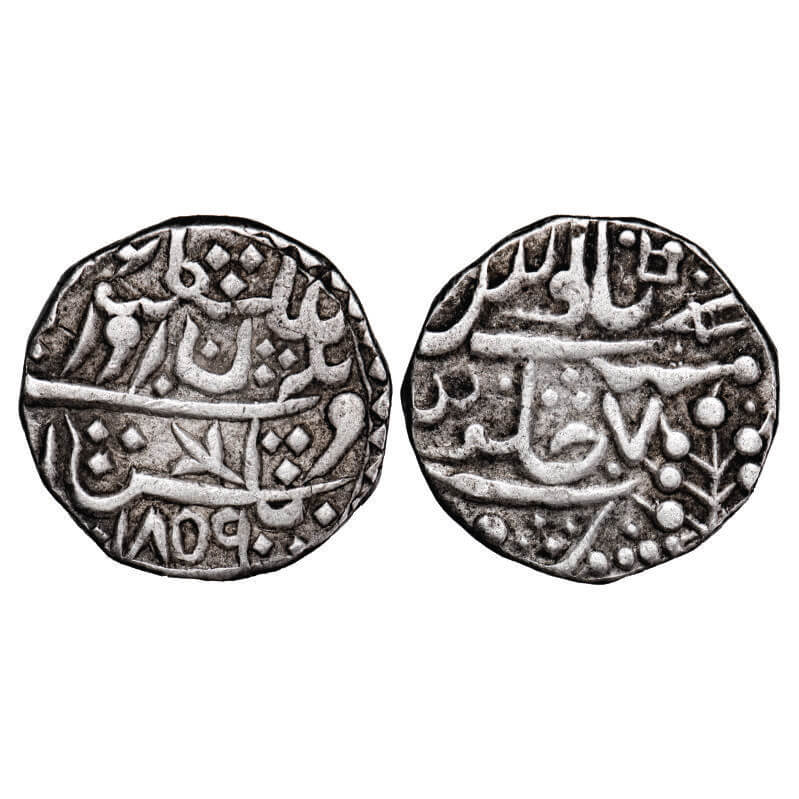 | Karauli, Silver Rupee, 11.07g, Madan Pal (AH 1270-1286 / 1854-1869 AD), with the name of Queen Victoria, 1859/7 AD, Nagari 'MA' inverted, katar and leaf symbol at top on reverse. Unlisted date in KM. Broad flan, About Extremely Fine, Rare. |