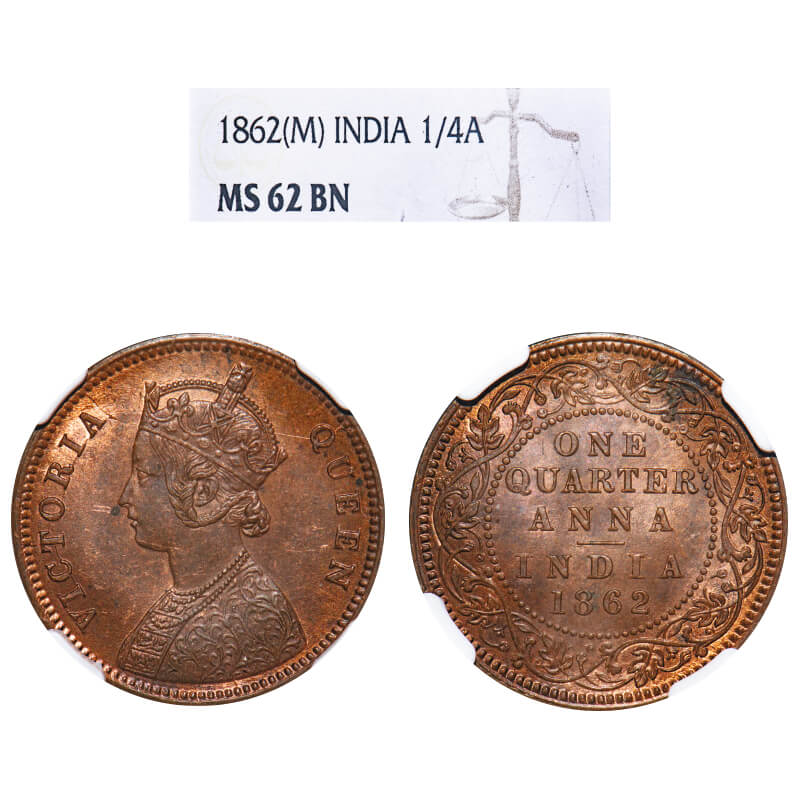 Victoria Queen, Copper, Quarter Anna, 1862, Madras Mint, A/I, No mint mark, No privy mark. F. Prid 604. GK 399. NGC Slabbed MS 62 BN. Rare.