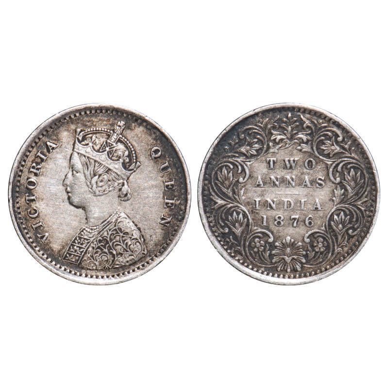Victoria Queen, Silver, 2 Annas, 1876, Bombay Mint, A/I, No mint mark, No dot. F. Prid 518. GK 743. Extremely Fine+. Rare.