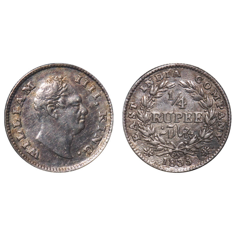 | William IV, Silver, 1/4 Rupee, 1835, Calcutta Mint, A/II, 'F' incused, Large & thick size letters of the legend, Wreath with 19 Berries (10L + 9R). F. Prid 89. GK 57. Extremely Fine. Rare. |