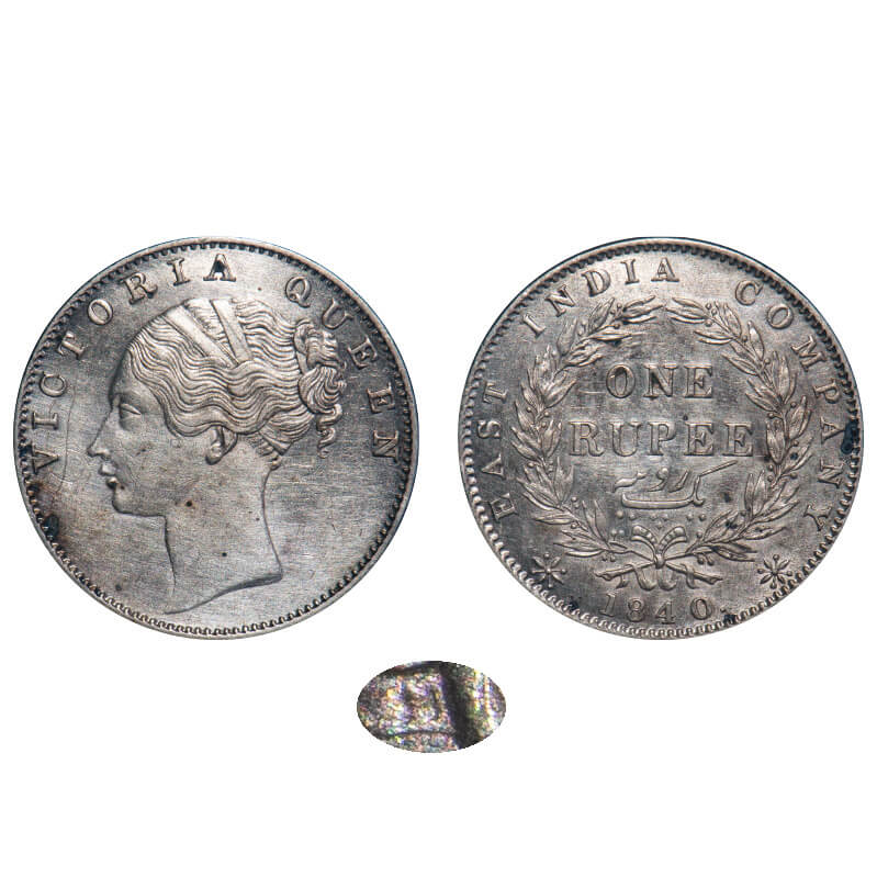 | Victoria Queen, Silver, Rupee, 1840, CL, Calcutta Mint, D/VI, With 'M' incused, Indian Head, Wreath with 35 Berries (20L + 15R), With tiny berry opposite 'O' of One, Struck through Error on Obv. F. Prid 44. GK 96. Almost Uncirculated. Rare. |