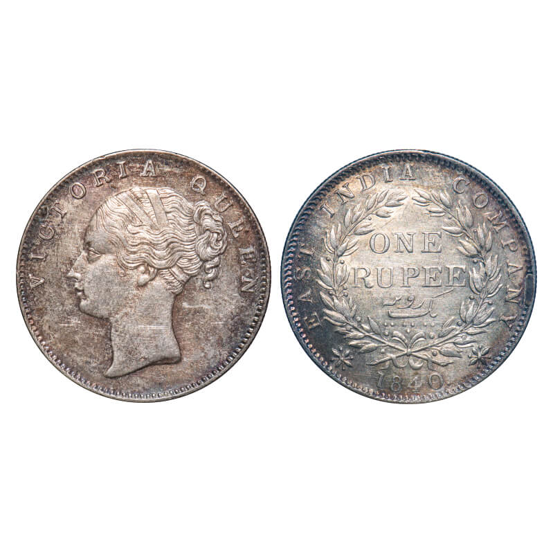 | Victoria Queen, Silver, Rupee, 1840, CL, Bombay Mint, A/II, English Head, Top tips of the wreath are near, With bud leaves above 'O' & 'E' of One, Wreath with 19 Berries (10L + 9R). F. Prid 51. GK 115. Almost Uncirculated, Toned. Very Scarce. |