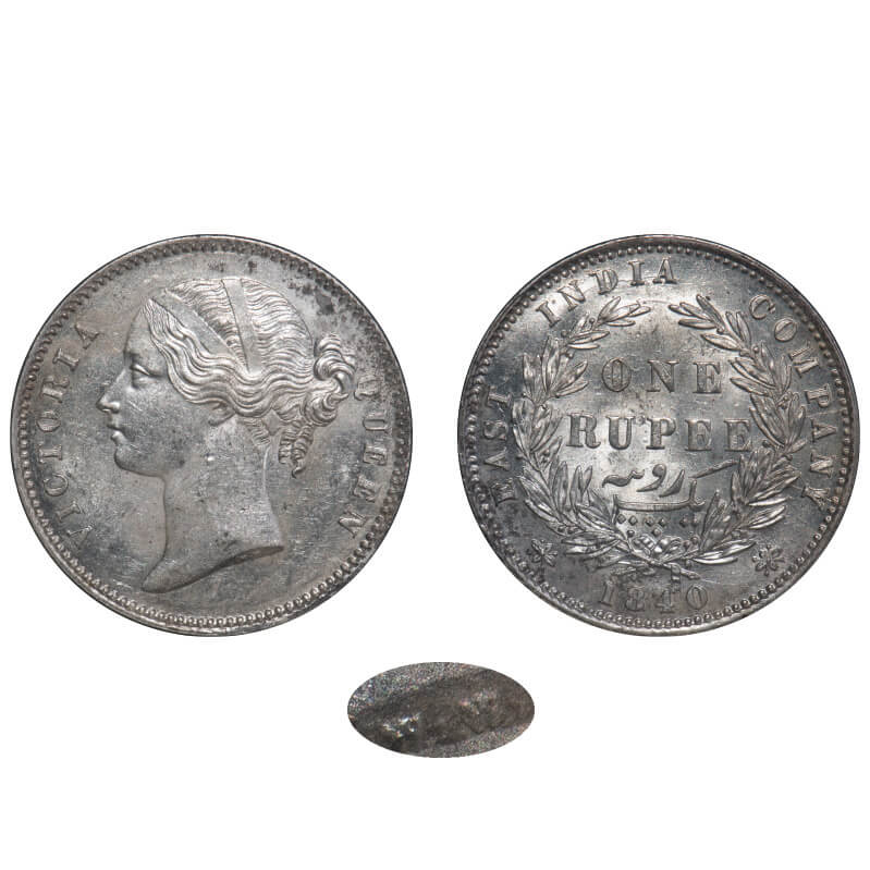 | Victoria Queen, Silver, Rupee, 1840, DL, Calcutta Mint, W.W. raised (W W double strucked), Die crack on Obv, Ghost on Rev. F. Prid Unlisted. GK Unlisted. Almost Uncirculated. Very Scarce. |