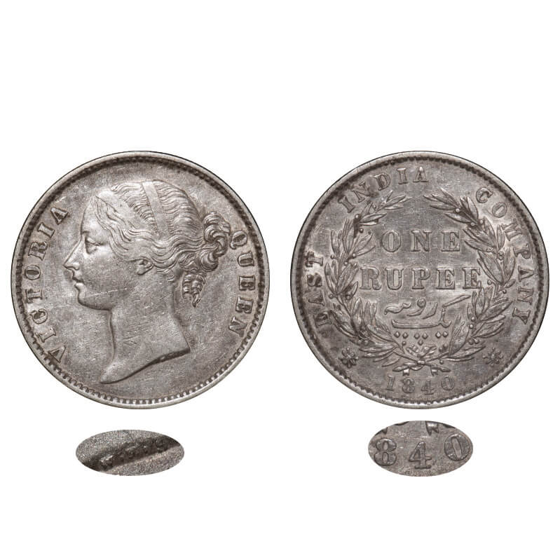 | Victoria Queen, Silver, Rupee, 1840, DL, Madras Mint, W.W., 'S' raised, Big 'S', Bottom curve of letter 'S' broken, Round berries, Dancing 4 in year date 1840, Wreath with 28 Berries (13L + 15R). F. Prid Unlisted. GK Unlisted. Very Fine. Very Rare. |