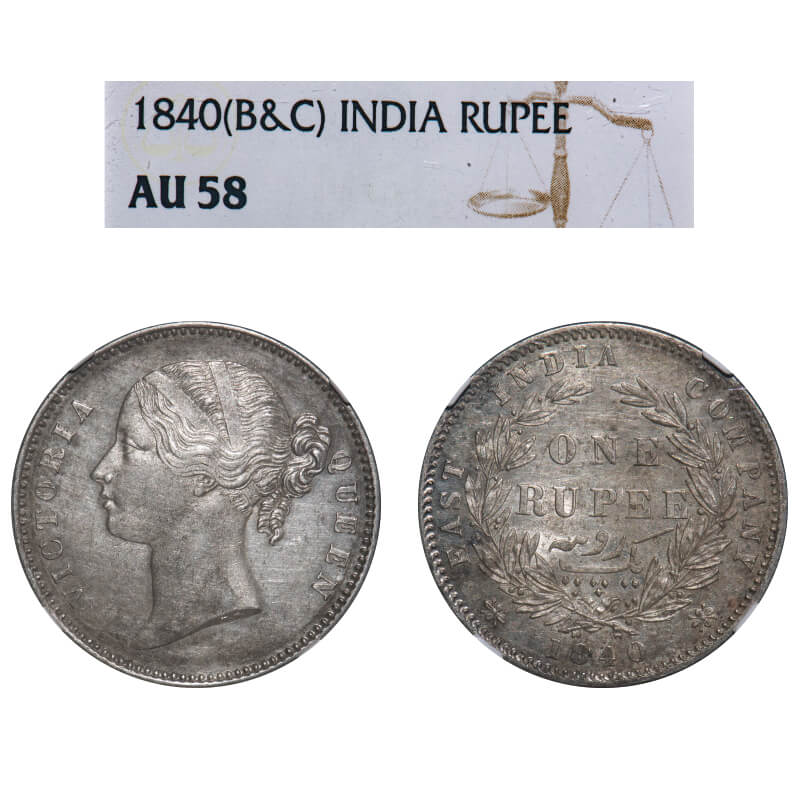 | Victoria Queen, Silver, Rupee, 1840, DL, Calcutta Mint, W.W. raised, Wreath with 28 Berries (13L + 15R), 'A' in India w/o central stroke, Re-engraving of hairs connecting hair lock. F. Prid 56. GK 167. NGC Slabbed AU 58. Very Scarce. |