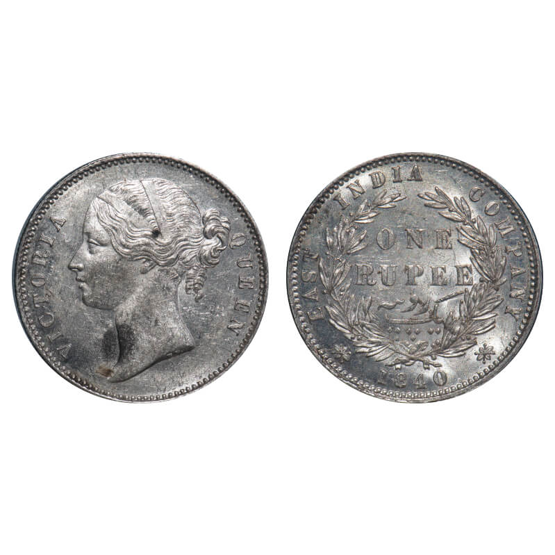 | Victoria Queen, Silver, Rupee, 1840, DL, Calcutta Mint, W.W. raised, 'A' in Victoria w/o centre stroke, looks like inverted 'V', Wreath with 28 Berries (13L + 15R). F. Prid 56. GK 168. About Uncirculated. Very Scarce. |