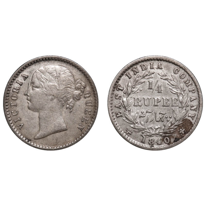 Victoria Queen, Silver, 1/4 Rupee, 1840, DL, Calcutta Mint, W.W. raised, Wreath with 10 Berries (6L + 4R), Numeral 4 w/o serif. F. Prid 105. GK 197. Very Fine+. Very Scarce.