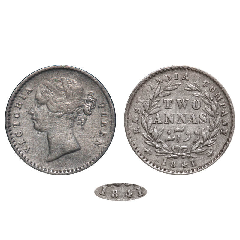 Victoria Queen, Silver, 2 Annas, 1841, DL, Calcutta Mint, W.W. raised, Wreath with 9 Berries (5L + 4R), Small numeral 8 & 4 in year date 1841. F. Prid 121. GK 216. Very Fine. Very Scarce.