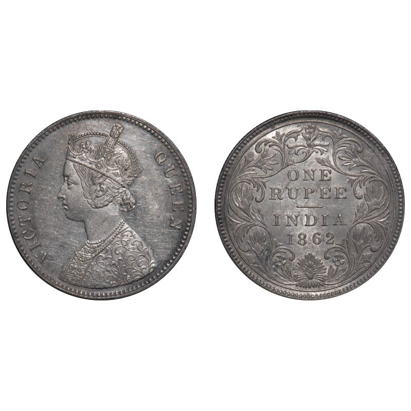 | Victoria Queen, Silver, Rupee, 1862, Calcutta Mint, A/II(i), With initial 'J', Pineapple like buds at Four different places, 3 Pineapple buds above 'O' 'N' and 'E' of One, 1 Pineapple bud above 2nd 'E' of Rupee, The flower above 'E' of One is thin. F. Prid 62. GK 244. Almost Uncirculated. Rare. |