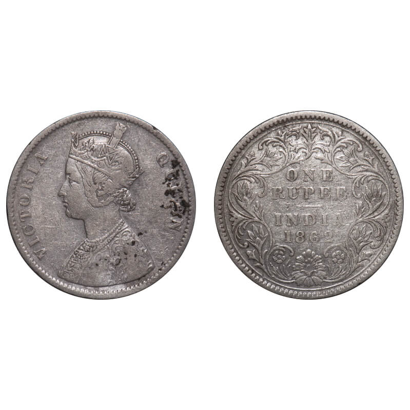 Victoria Queen, Silver, Rupee, 1862, Calcutta Mint, A/III, w/o initial 'J'. F. Prid 65. GK 254. Very Fine. Very Scarce.