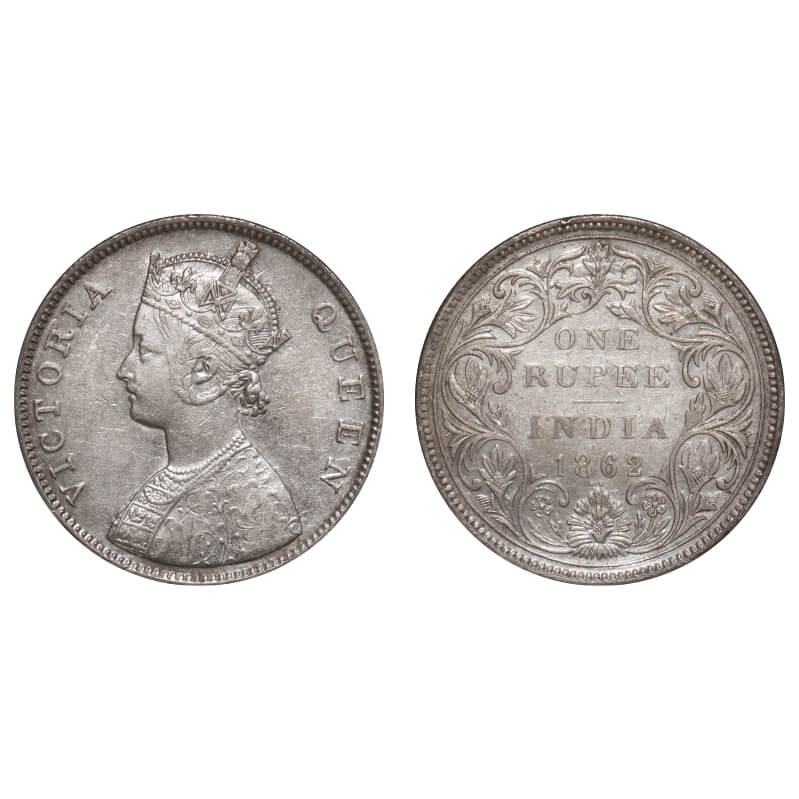 | Victoria Queen, Silver, Rupee, 1862, Bombay Mint, B/II/0/3, w/o initial 'J', Large dots, Dots arranged are in horizontal line. F. Prid 77. GK 300. Extremely Fine+. Very Scarce. |