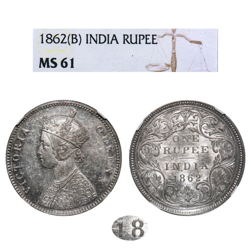 | Victoria Queen, Silver, Rupee, 1862, Bombay Mint, A/II/0/6, w/o bottom stroke of numeral 1, w/o initial 'J', Bottom curve of numeral 8 broken. F. Prid 86. GK 323. NGC Slabbed MS 61. Very Rare. |