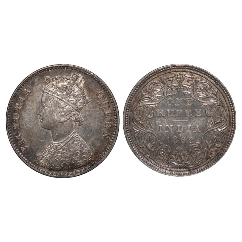 Victoria Queen, Silver, Rupee, 1862, Bombay Mint, A/II/0/7, w/o initial 'J'. F. Prid 87. GK 329. Uncirculated, Toned. Very Scarce.