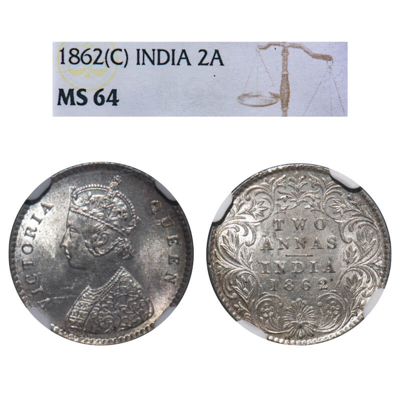 Victoria Queen, Silver, 2 Annas, 1862, Calcutta Mint, A/I, Bottom flower centre top petal broader then Left & Right connceting petals. F. Prid 485. GK 381. NGC Slabbed MS 64. Extremely Rare.