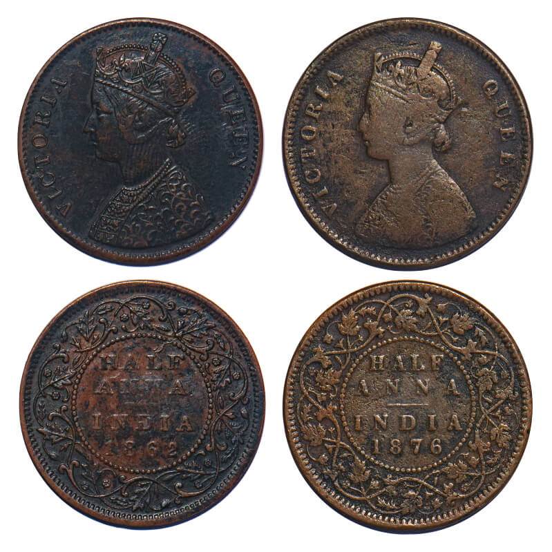 | Victoria Queen, Copper, Half Anna, (2 coins), 1) 1862, Bombay Mint, A/I(i), Flowers with 5 dots around a centre dot, 2) 1876, Calcutta Mint, B/II. F. Prid Unlisted, 584. GK 393, 819. Fine+ to Extremely Fine+. Very Scarce. |