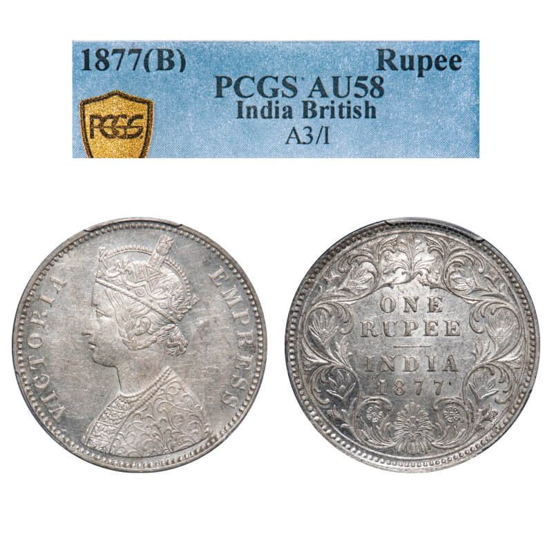Victoria Empress, Silver, Rupee, 1877, Bombay Mint, A3/I, Dot. F. Prid 150. GK 444. PCGS Slabbed AU 58. Rare.