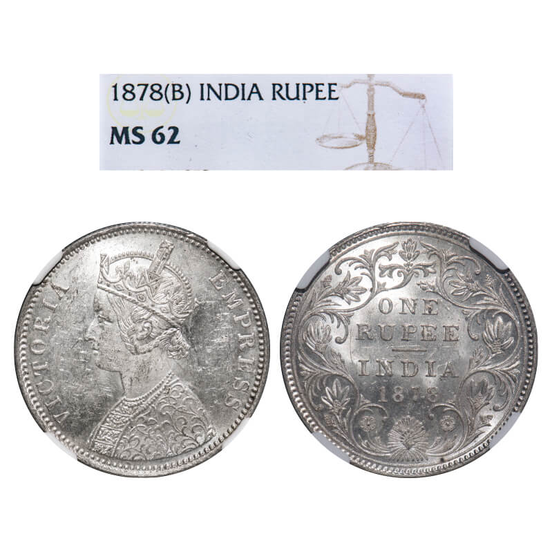 Victoria Empress, Silver, Rupee, 1878, Bombay Mint, A3/II(ii), Dot. F. Prid Unlisted. GK 453. NGC Slabbed MS 62. Very Rare.