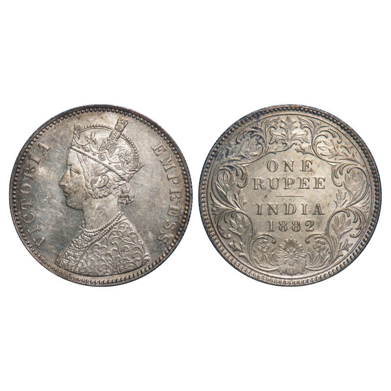 Victoria Empress, Silver, Rupee, 1882, Bombay Mint, A3/I, Dot, Ghost on Obv & Rev. F. Prid 160. GK 474. Uncirculated with original mint luster. Rare.