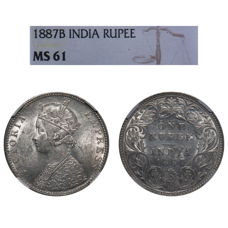 Victoria Empress, Silver, Rupee, 1887, Bombay Mint, C2/I(ii), 'B' incused, B incused inverted. F. Prid Unlisted. GK 546. NGC Slabbed MS 61. Very Rare.