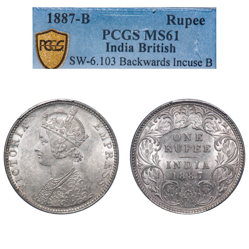 Victoria Empress, Silver, Rupee, 1887, Bombay Mint, C2/I(ii), 'B' incused, B incused inverted. F. Prid Unlisted. GK 546. PCGS Slabbed MS 61. Very Rare.
