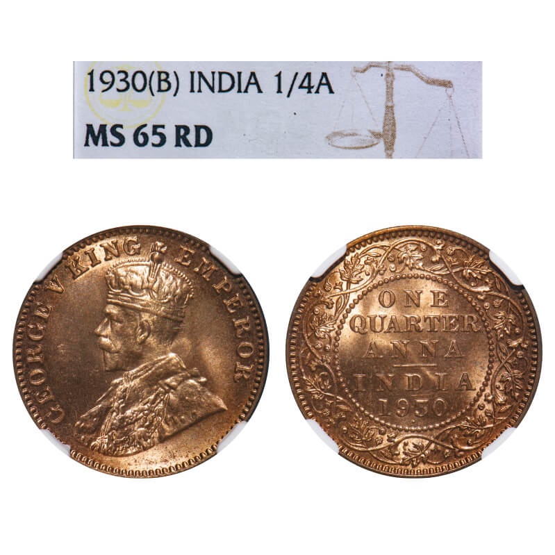 George V, Bronze, Quarter Anna, 1930, Bombay Mint, Dot, Elephant. F. Prid 671. GK 1190. NGC Slabbed MS 65 RD. Extremely Rare.