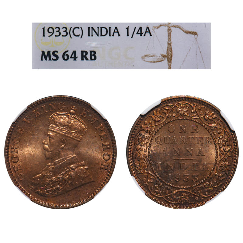 George V, Bronze, Quarter Anna, 1933, Calcutta Mint, No dot, Elephant. F. Prid 673. GK 1193. NGC Slabbed MS 64 RB. Extremely Rare.