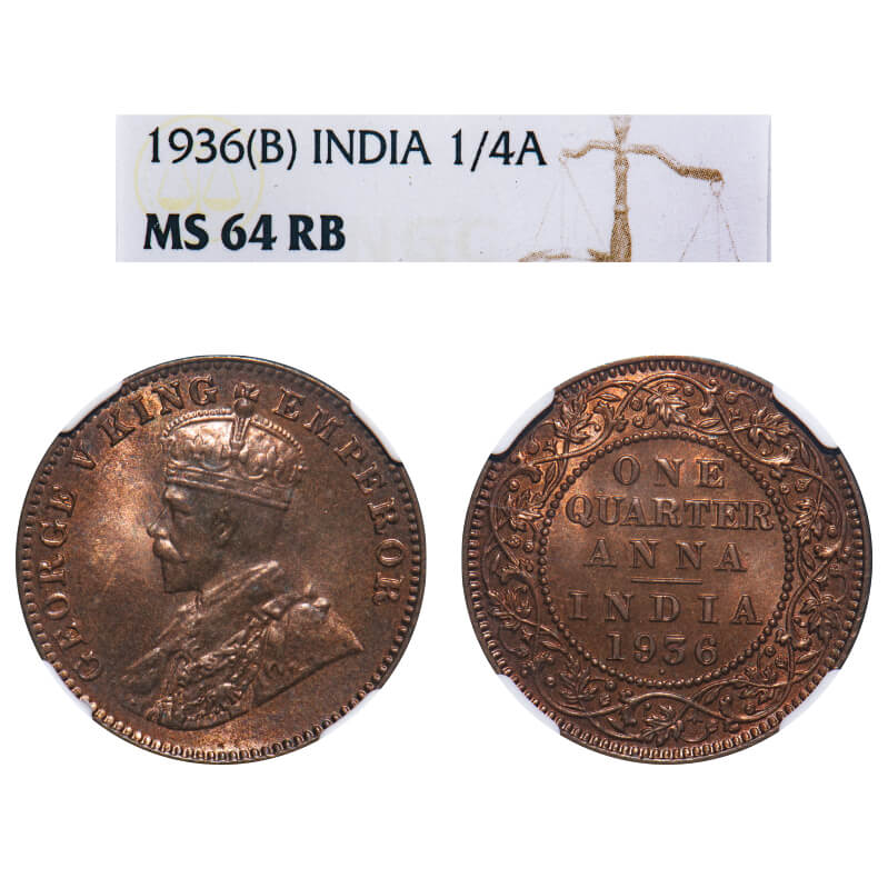 George V, Bronze, Quarter Anna, 1936, Bombay Mint, Dot, Elephant. F. Prid 683. GK 1196. NGC Slabbed MS 64 RB. Very Rare.