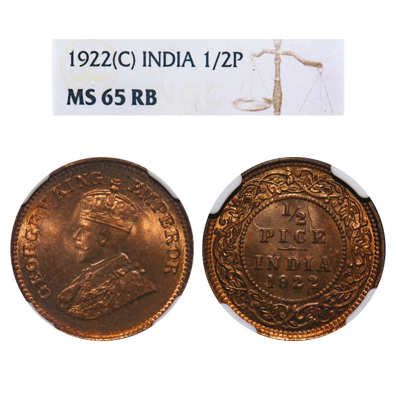 George V, Bronze, 1/2 Pice, 1922, Calcutta Mint, No mint mark. F. Prid 755. GK 1208. NGC Slabbed MS 65 RB. Extremely Rare.