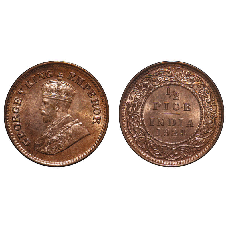 George V, Bronze, 1/2 Pice, 1924, Calcutta Mint, No mint mark. F. Prid 757. GK 1210. Mint State. Rare.