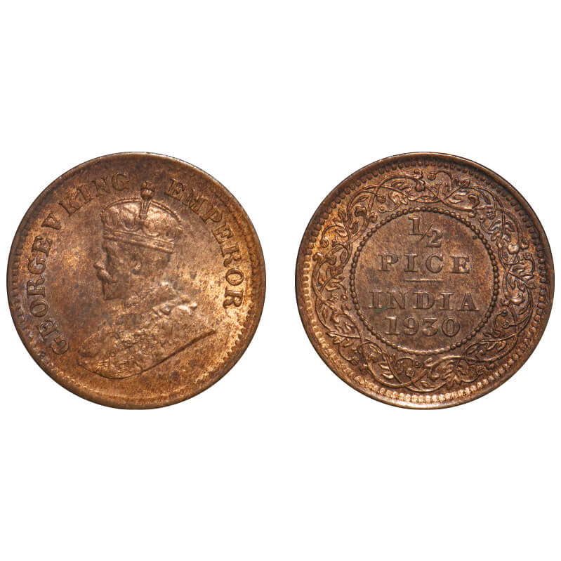 George V, Bronze, 1/2 pice, 1930, Calcutta Mint, No mint mark. F. Prid 763. GK 1216. Brilliant Uncirculated. Very Scarce.