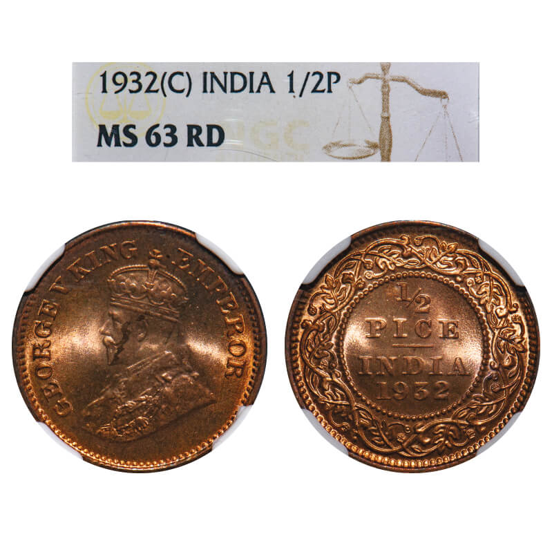 George V, Bronze, 1/2 Pice, 1932, Calcutta Mint, No mint mark. F. Prid 765. GK 1218. NGC Slabbed MS 63 RD. Rare.