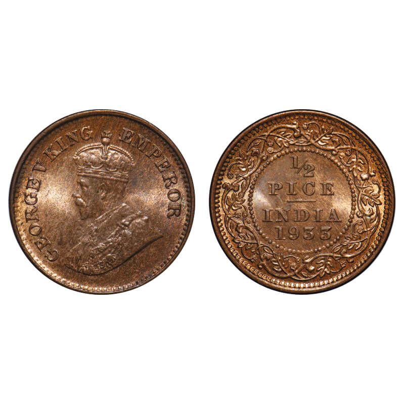 George V, Bronze, 1/2 Pice, 1933, Calcutta Mint, No mint mark. F. Prid 766. GK 1219. Mint State. Rare.