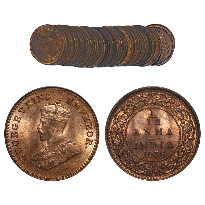 | George V, Bronze, 1/12 Anna, (Lot of 24 coins), 1912, 1913, 1914, 1915, 1916, 1917, 1918, 1919, 1920, 1921, 1923, 1924, 1925, 1926, 1927, 1928, 1929, 1930, 1931, 1932, 1933, 1934, 1935, 1936. Fine+, Details to Uncirculated. Scarce as a lot. |
