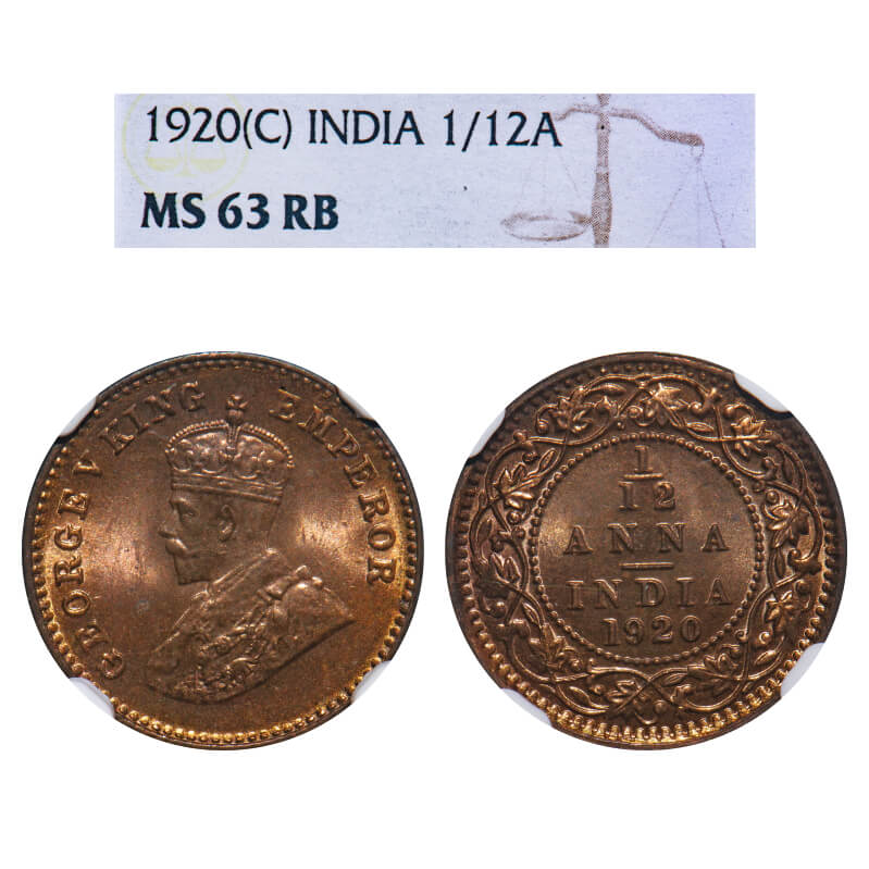 George V, Bronze, 1/12 Anna, 1920, Calcutta Mint, No dot. F. Prid 835. GK 1231. NGC Slabbed MS 63 RB. Very Rare.