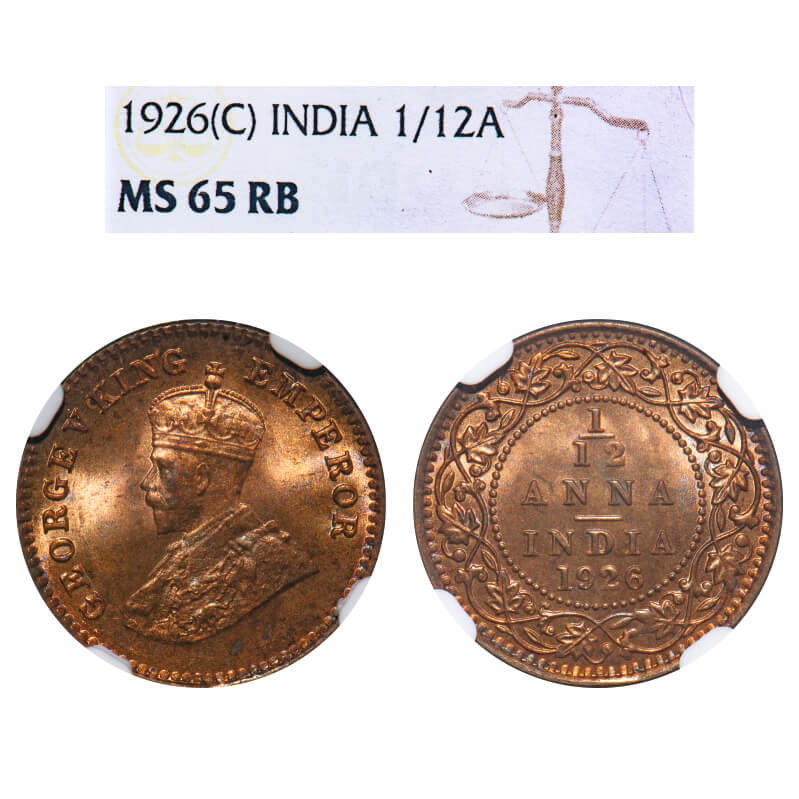 George V, Bronze, 1/12 Anna, 1926, Calcutta Mint, No dot. F. Prid 840. GK 1240. NGC Slabbed MS 65 RB. Extremely Rare.