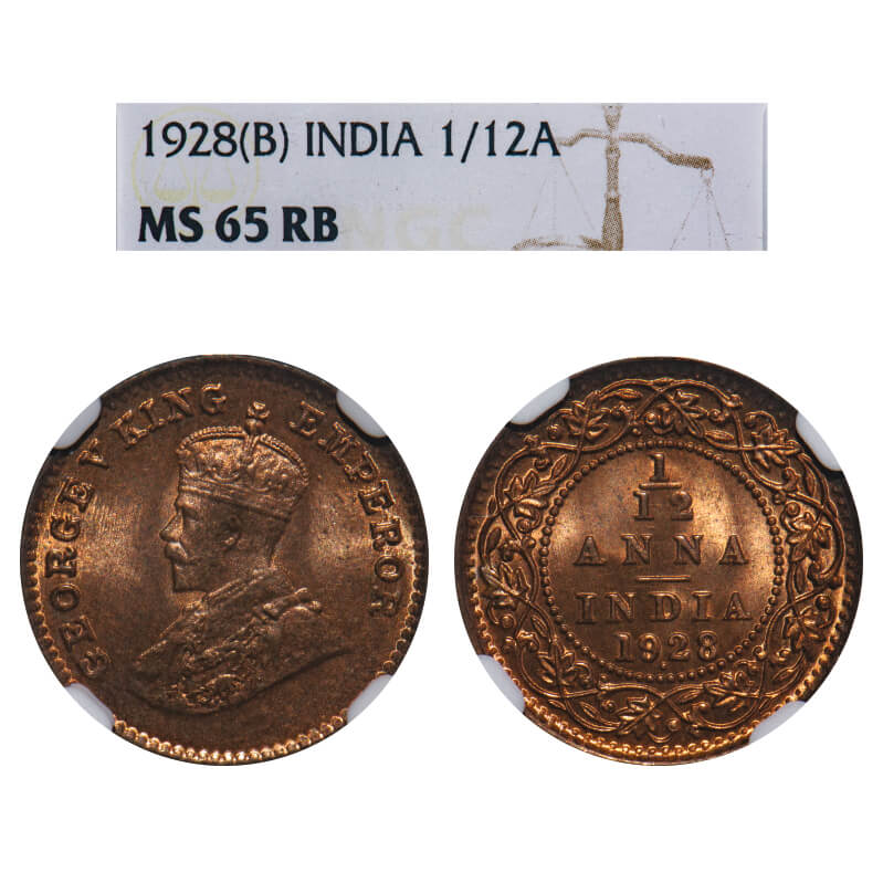 George V, Bronze, 1/12 Anna, 1928, Bombay Mint, Dot. F. Prid 856. GK 1243. NGC Slabbed MS 65 RB. Extremely Rare.