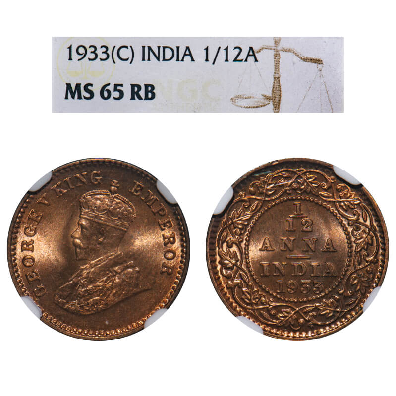 George V, Bronze, 1/12 Anna, 1933, Calcutta Mint, No dot. F. Prid 847. GK 1249. NGC Slabbed MS 65 RB. Extremely Rare.