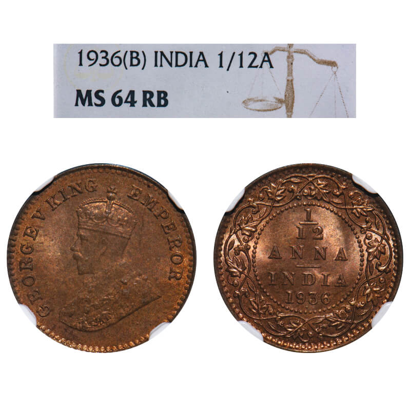 George V, Bronze, 1/12 Anna, 1936, Bombay Mint, Dot. F. Prid 857. GK 1252. NGC Slabbed MS 64 RB. Extremely Rare.