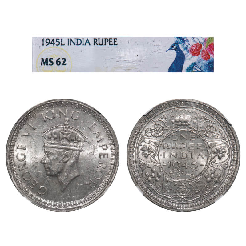 | George VI, Half Silver, Rupee, 1945, Lahore Mint, D/II, 'L' raised, Security edge, Normal 5, Thick 'L'. F. Prid 248. GK 1288. NGC Slabbed MS 62. Very Rare. |