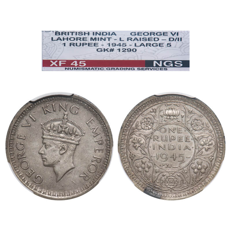 | George VI, Half Silver, Rupee, 1945, Lahore Mint, D/II, 'L' raised, Security edge, Large 5. F. Prid 248. GK 1290. NGS Slabbed XF 45. Rare. |
