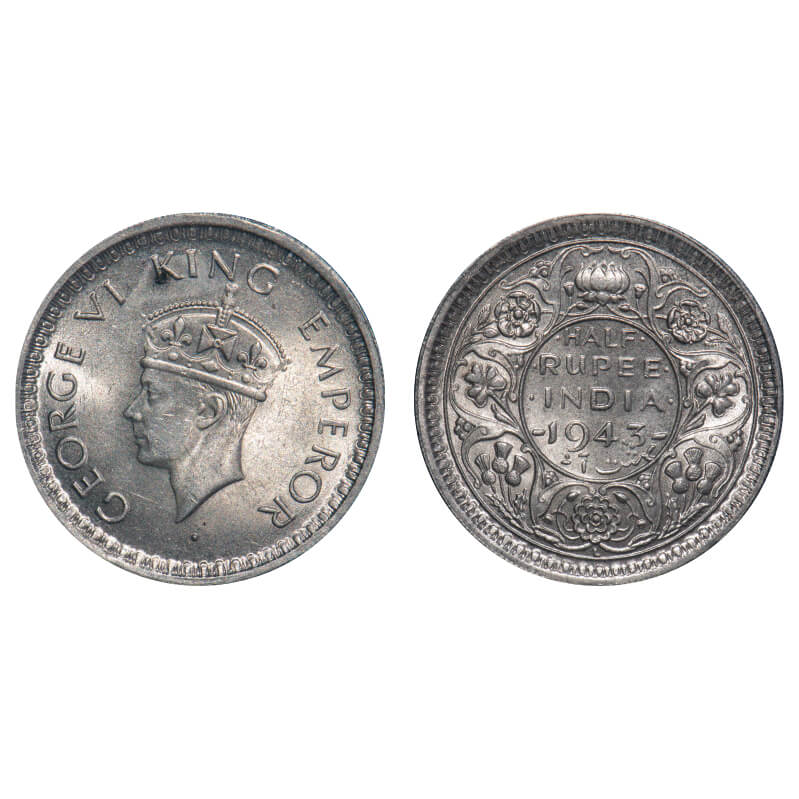George VI, Half Silver, Half Rupee, 1943, Bombay Mint, B/II, Dot, Head Type II, Security edge, With...