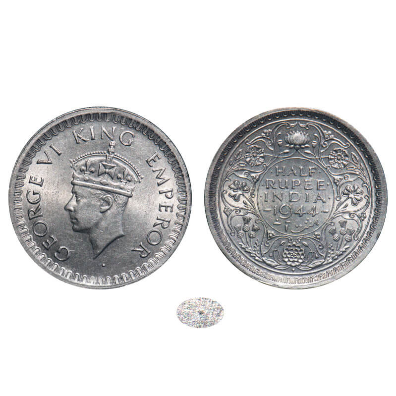 | George VI, Half Silver, Half Rupee, 1944, Bombay Mint, B/III, Diamond, Head Type II, Security edge, With tiny Diamond shape mark on Obv, Ghost on Rev. F. Prid Unlisted. GK 1309. Uncirculated. Rare. |