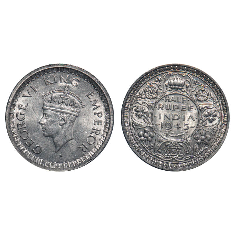 George VI, Half Silver, Half Rupee, 1945, Bombay Mint, B/II, Dot, Head Type II, Security edge, Rev ...