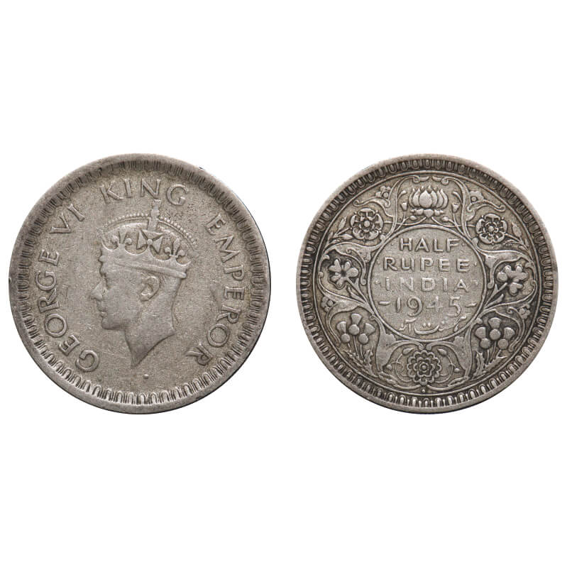 George VI, Half Silver, Half Rupee, 1945, Bombay Mint, B/II, Dot, Head Type II, Milled edge, Rev le...